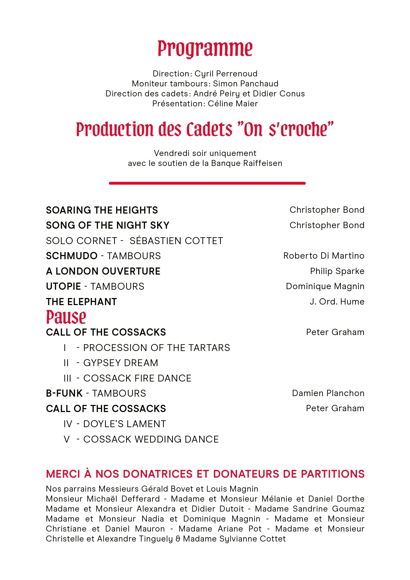 Les cadets On s’croche ainsi que les cadets de Siviriez, qui auront la chance de participer à une session Masterclass dirigée par le soliste lui-même, se produiront également lors de nos deux concerts les 13 et 14 décembre prochain.